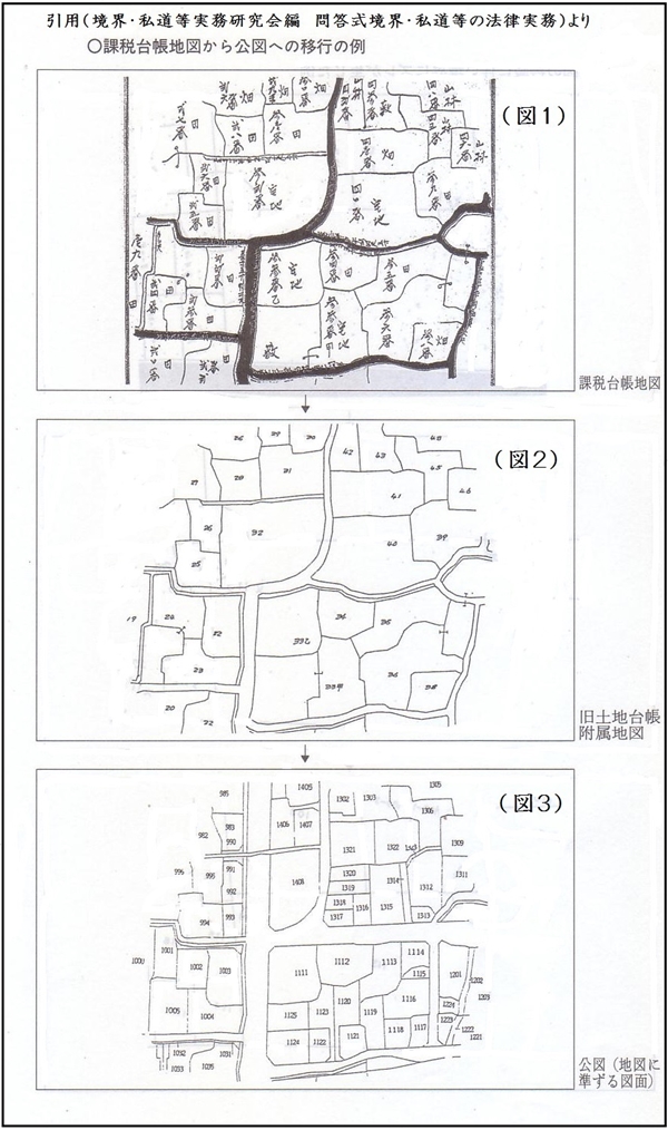 その後、昭和35年の不動産登記法改正までに、国土調査、区画整理など法により作成された地籍図も、旧土地台帳付属地図として法務省所管の登記所に備え付けられてきました。これらを公図(図3)と呼んでいます。